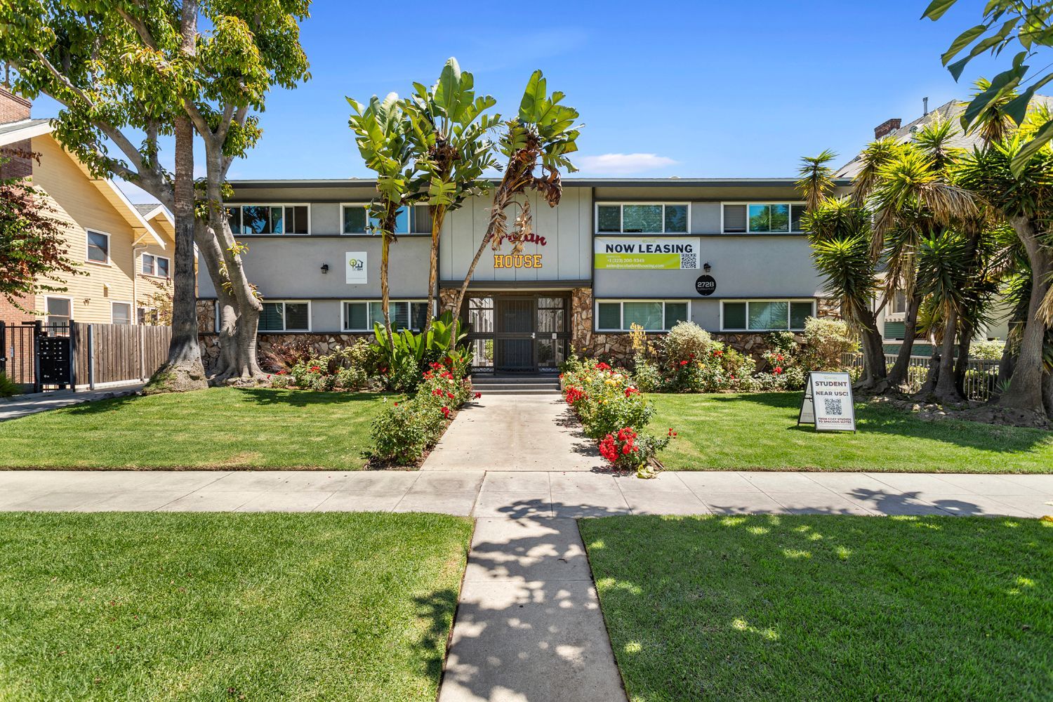 Trojan House is a classic two-story, 16-unit apartment building offering a mix of spacious 1 bed / 1 bath, 2 bed / 1 bath, and 3 bed / 2 bath apartments—perfect for students seeking comfort, convenience, and a true collegiate living experience. Located on Ellendale Place in the heart of University Park, The Trojan House is just a short walk to USC and The Row, situated within both the DPS patrol zone and USC’s free Lyft area. The building sits on a quiet, tree-lined street and is gated for added security and peace of mind. Each unit features beautiful wood flooring, air conditioning, modern kitchens with high-end appliances, and access to shared or in-unit laundry. Select unit have in-unit laundry.